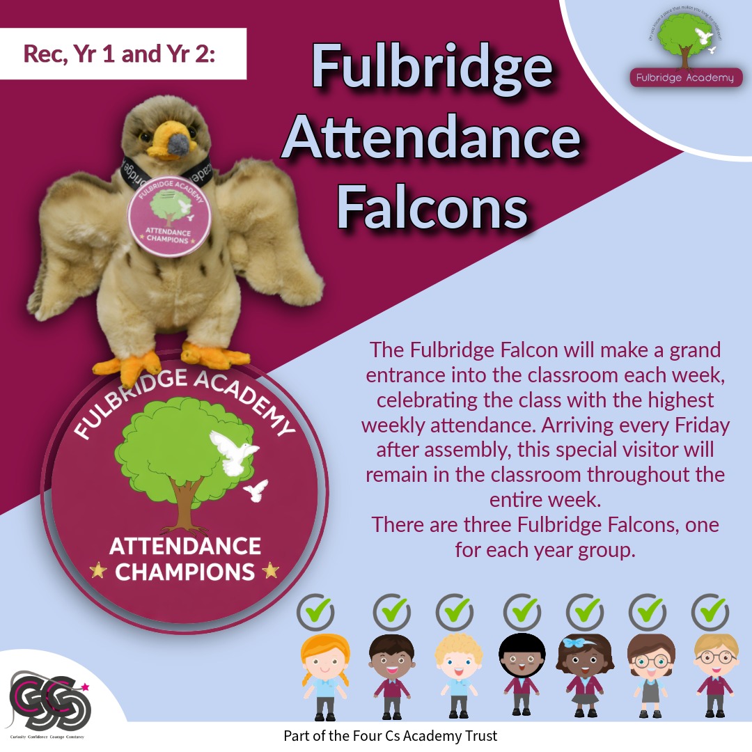 We are excited to announce that three Fulbridge Attendance Falcons will be visiting Reception, Year 1, and Year 2 classrooms to celebrate the class with the highest weekly attendance.