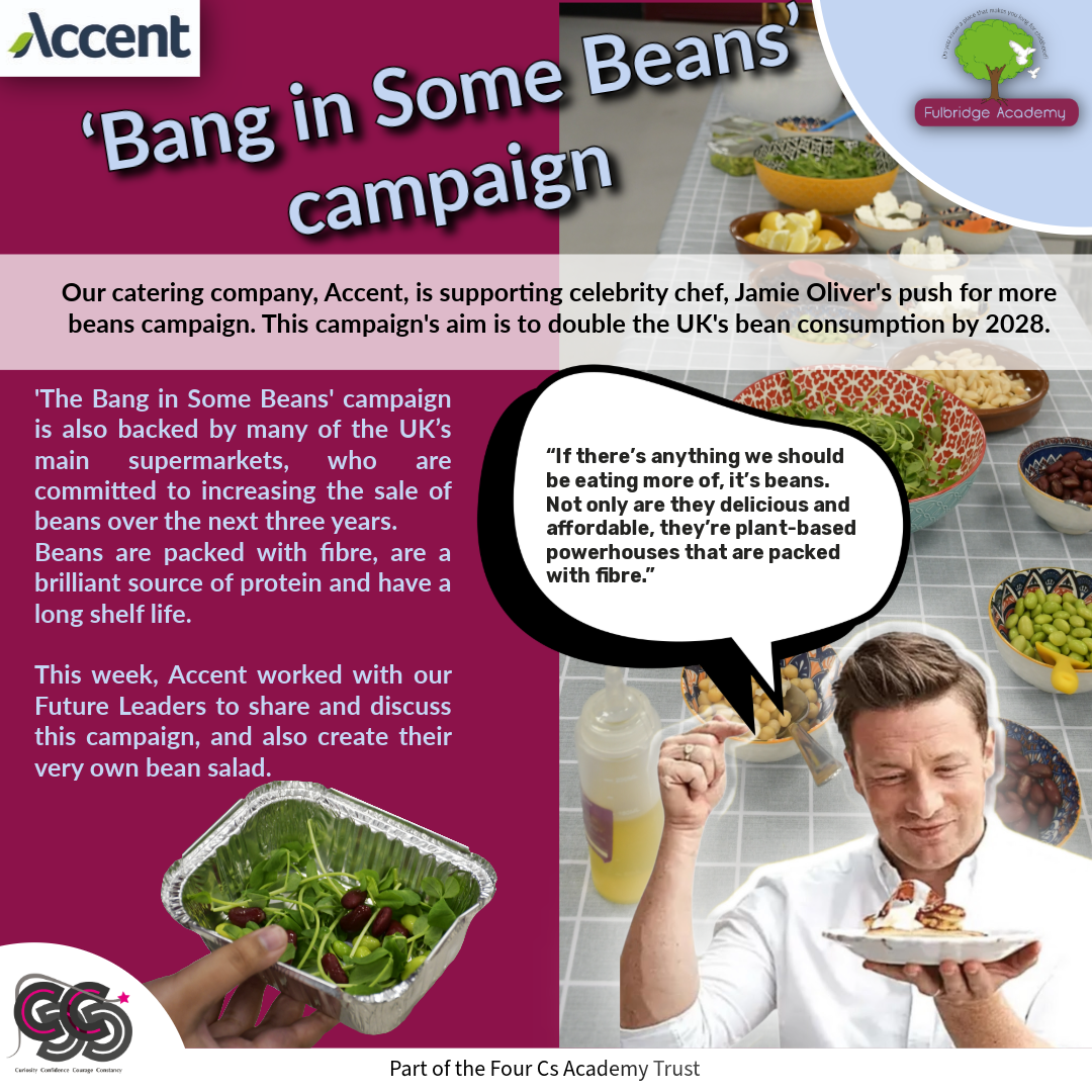 Our catering company, Accent, is supporting celebrity chef, Jamie Oliver's push for more beans campaign. This campaign's aim is to double the UK's bean consumption by 2028.