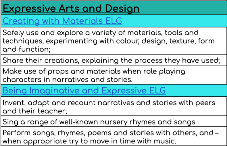 Below are the 17 areas that make up the Early Learning Goals (ELG). They each have a detailed explanation of what children can do to achieve each one.